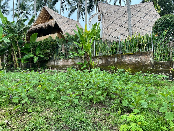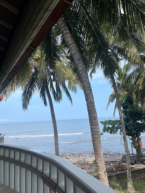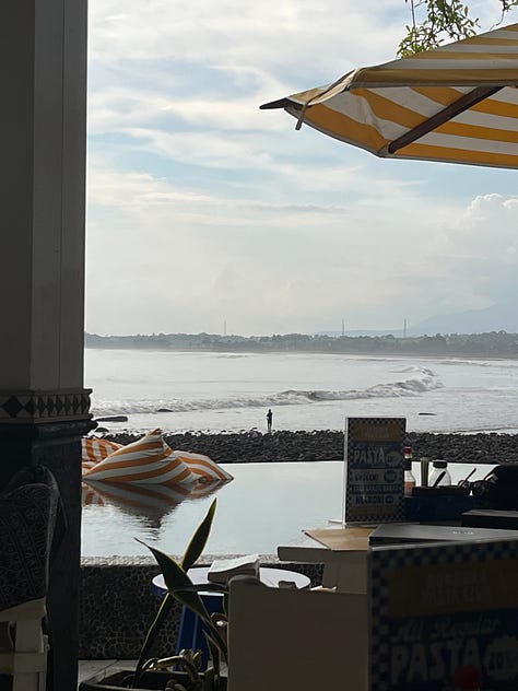 In an hour our driver Gede will pick us up to take us to our accommodation in Ubud. A three hour drive. We’ve known Gede since our first trip here in 2018. He brought McDonald’s to the hospital when Sam had his accident in 2022, his wife had come with him and brought a herbal remedy she’d made for the bruising. There’s a photo of Sam and Gede taken here in Medewi in 2023, by the pool of this very same hotel. On the drive out here we passed rice fields and homes with a garden and chickens. Gede lives in the city, he said “that’s all I’d wish for, my morning coffee, a garden and the chickens, that would be my dream”. I hope to hold onto that for a long time.